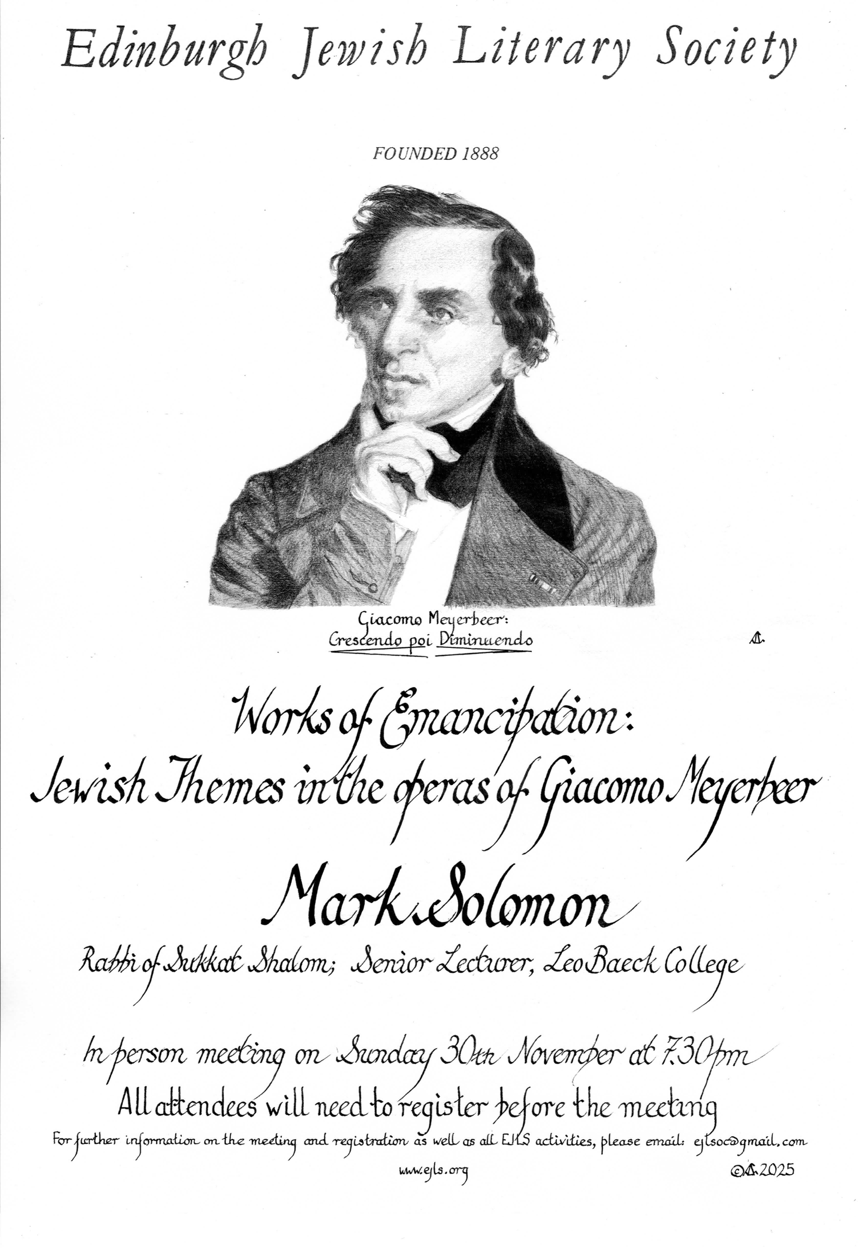 The name of Meyerbeer is all but unknown today, except to serious opera buffs, but in his time (1791–1864) he was one of the most celebrated composers in the world, famous as the leading exponent of French grand opéra. A scion of the wealthiest Jewish family of Berlin, with religious roots in the early Haskalah (Enlightenment) movement. Meyerbeer lived a secular life devoted to music in Italy, Paris, and as court composer to the King of Prussia. Unlike other Jewish musicians of his time, however, he did not follow the fashion of conversion to Christianity, but kept the vow he had made to his formidable mother – an influential figure in her own right – to remain faithful to the religion of his forebears. Throughout his life he was alert to signs of antisemitism, and suffered particularly from the vicious attacks of Wagner. This talk, illustrated with musical examples, will argue that, beneath the surface of his operas dealing with grand historical – and often Christian – themes, lies a sharp awareness of the issues confronting Jews of his time: emancipation, enlightenment, conversion, intermarriage, and of course, persecution. After a brief consideration of his first, and only biblical opera, Jephtha’s Vow (1812), we will focus on his most famous work, Les Huguenots (1836) and his last, posthumously produced opera, L’Africaine (1865).