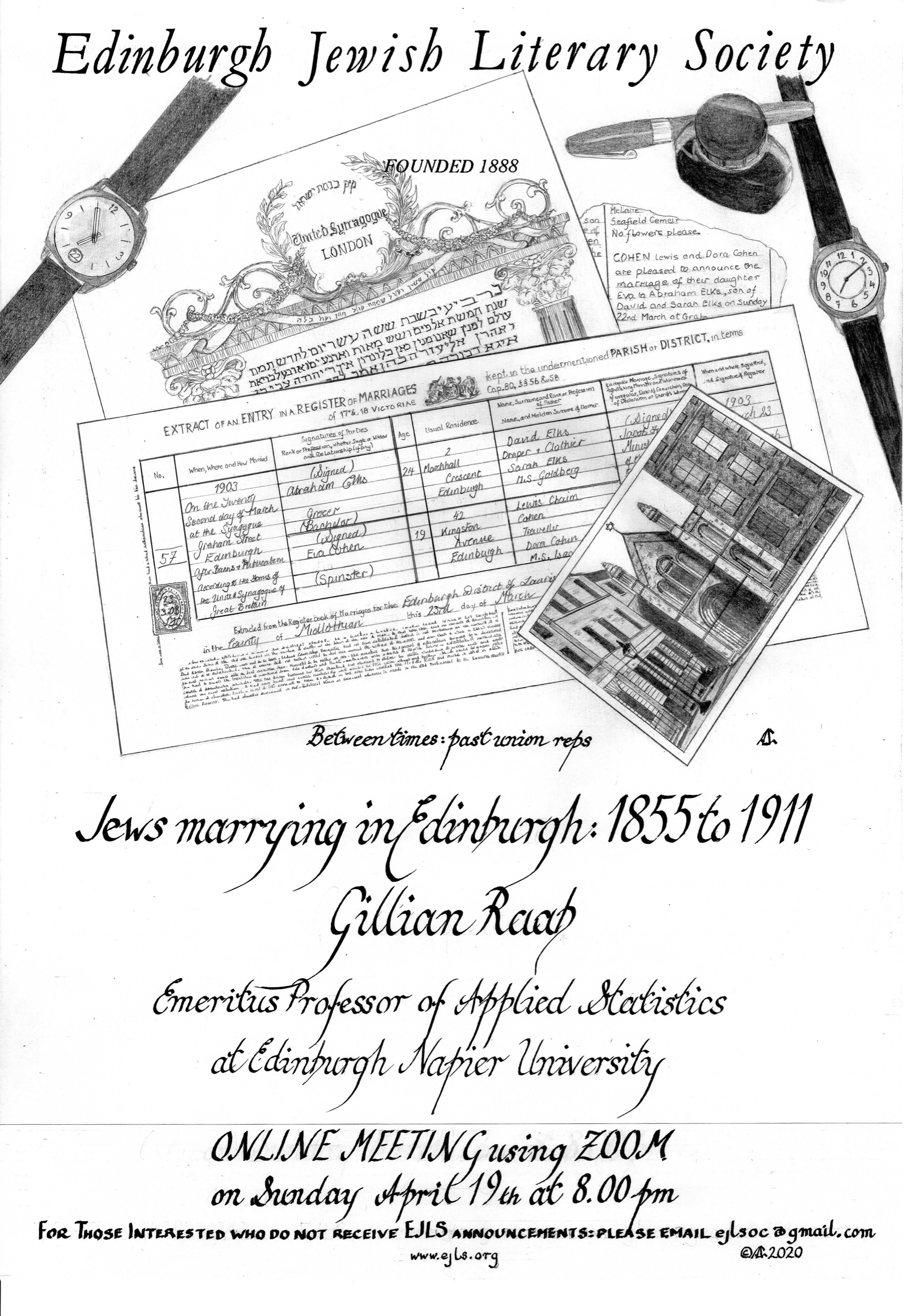 This talk will take at its starting point 354 marriages, registered in Edinburgh between 1855 and 1911 where the bride or groom, or both, were Jewish. The records were assembled as part of a demographic study of 200 years of Scottish Jewry. We can look at where they lived. their occupations, the families they came from, and those they formed. For the 271 marriages with a Jewish ceremony, we will profile some of the rabbis who officiated at them and the communities they served. During the later part of the period there were three main Jewish Communities in Edinburgh, just as there are now. The talk will look at similarities and differences between Jewish communities in Edinburgh then and now.