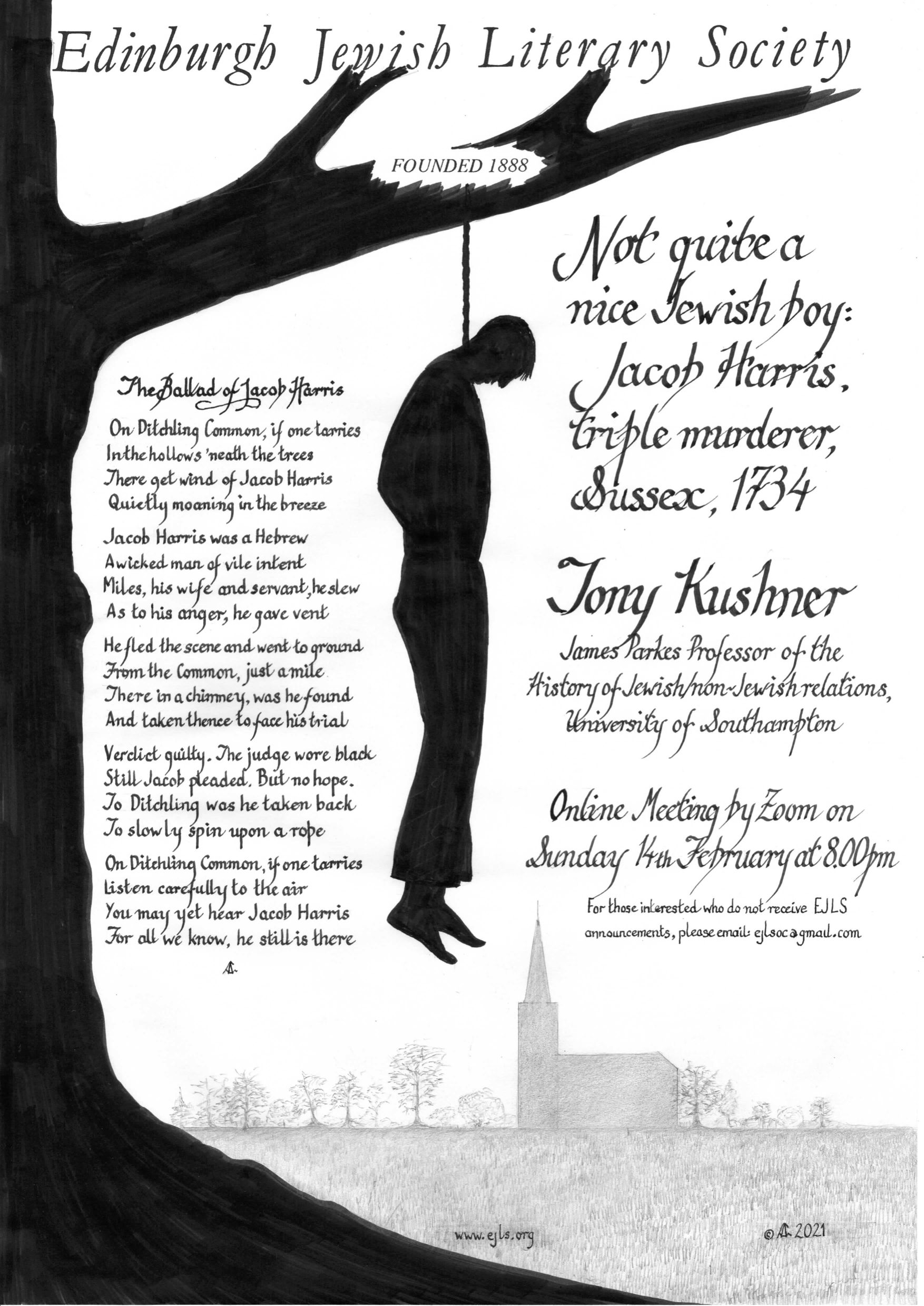 We tend to think of Jews as victims rather than perpetrators in early British Jewish history. Whilst not denying the deep-rooted nature of antisemitism in culture and in violent manifestations, this talk will also reference what might be called the ‘tough Jew’ tendency in the world outside the law and where integration in the criminal underworld was perhaps the norm. In the spring of 1734, Jacob Harris (or Hirsch) murdered in the most bloodthirsty way imaginable a publican, his wife and his servant. He was caught a little later some distance from the crime scene, found guilty and hanged in Horsham and then his body sent to Ditchling Common to be gibbeted. Surprisingly, there seems to have been no antisemitism associated with the murders at the time and subsequently Jacob Harris became a folk hero in this area of mid-Sussex. This talk will explore how Jacob Harris came to be in Ditchling Common – was he, as memory of him insisted, a pedlar, or was he a smuggler or a highwayman (or, indeed, all three)? It will ask how he has been imagined and remembered subsequently in ballad, fiction and local history and how we can try to make sense of his Jewish identity.